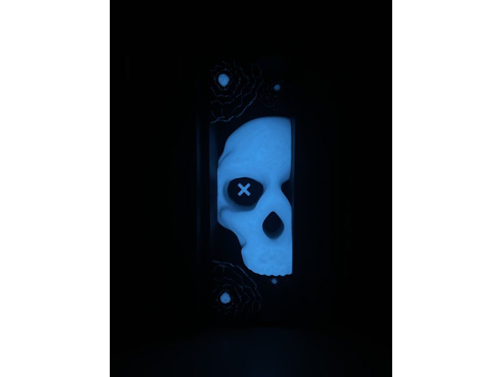 Tyrkysová lebka v kontrastu s černým rámem a květy dává celému kusu dramatický, ale zároveň estetický charakter.